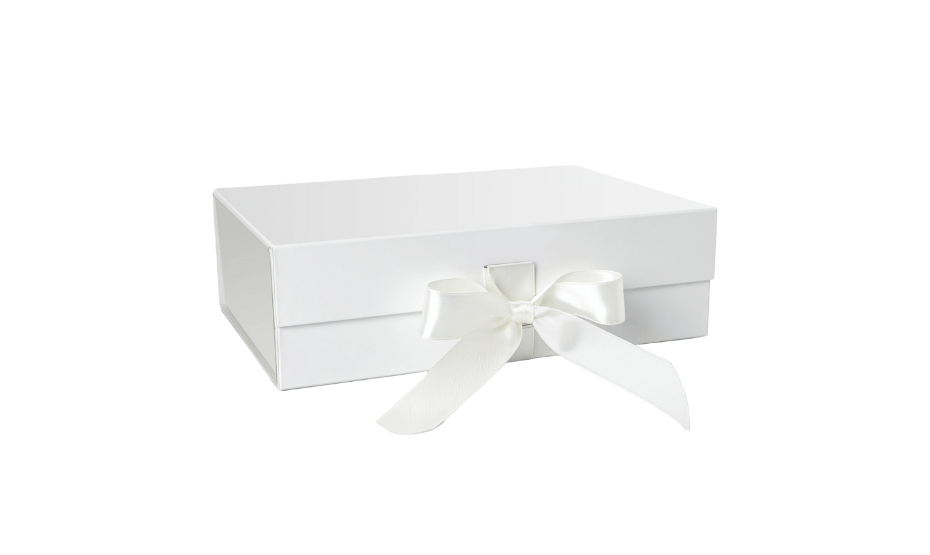 A sophisticated white gift box featuring a luxurious satin ribbon for an elegant presentation. The sturdy, eco-friendly construction ensures durability while the smooth matte finish adds a premium touch. Perfect for jewelry, cosmetics, luxury gifts, and special occasions like birthdays, weddings, and anniversaries.